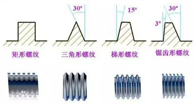螺纹按其截面形状(牙型)分为三角形螺纹、矩形螺纹、梯形螺纹和锯齿形螺纹等。